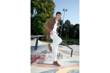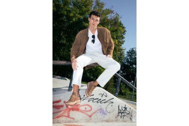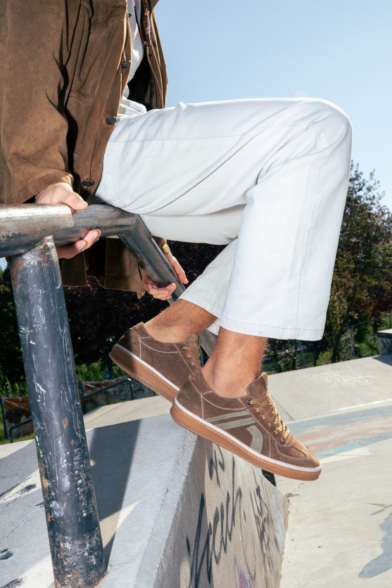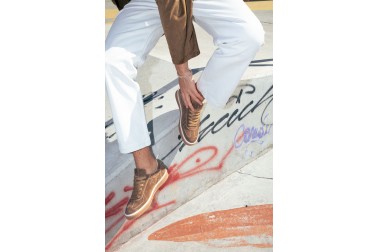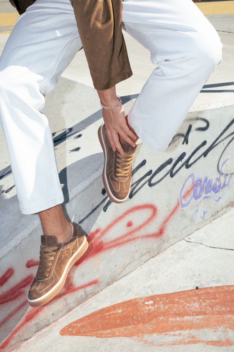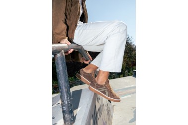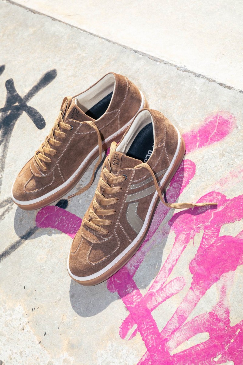 Linee pulite e silhouette minimal definiscono Renovo District, realizzata in pelle nubuck e velour nelle tonalità del marrone e del verde. Il motivo a linee, elemento ricorrente nel linguaggio stilistico di Re.novo, dona un senso di movimento ed energia che richiama il ritmo della vita urbana. La suola leggera con cucitura a vista aggiunge un tocco moderno e distintivo, senza rinunciare al comfort.