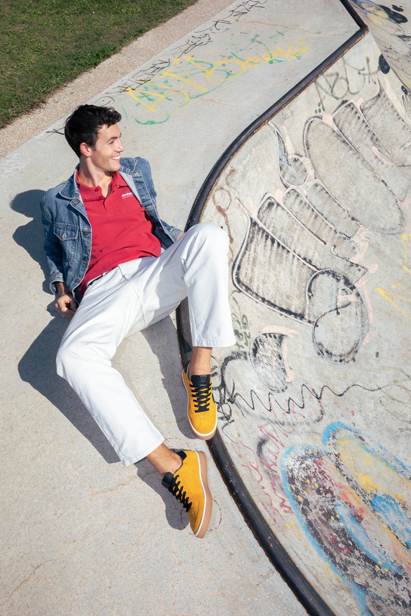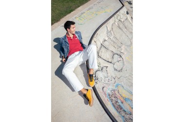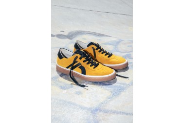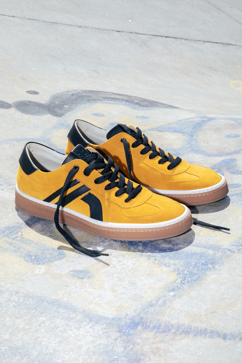Linee pulite e silhouette minimal definiscono Renovo Rush, realizzata in pelle di vitello e velour nelle tonalità del giallo. Il motivo a linee, elemento ricorrente nel linguaggio stilistico di Re.novo, dona un senso di movimento ed energia che richiama il ritmo della vita urbana. La suola leggera con cucitura a vista aggiunge un tocco moderno e distintivo, senza rinunciare al comfort.